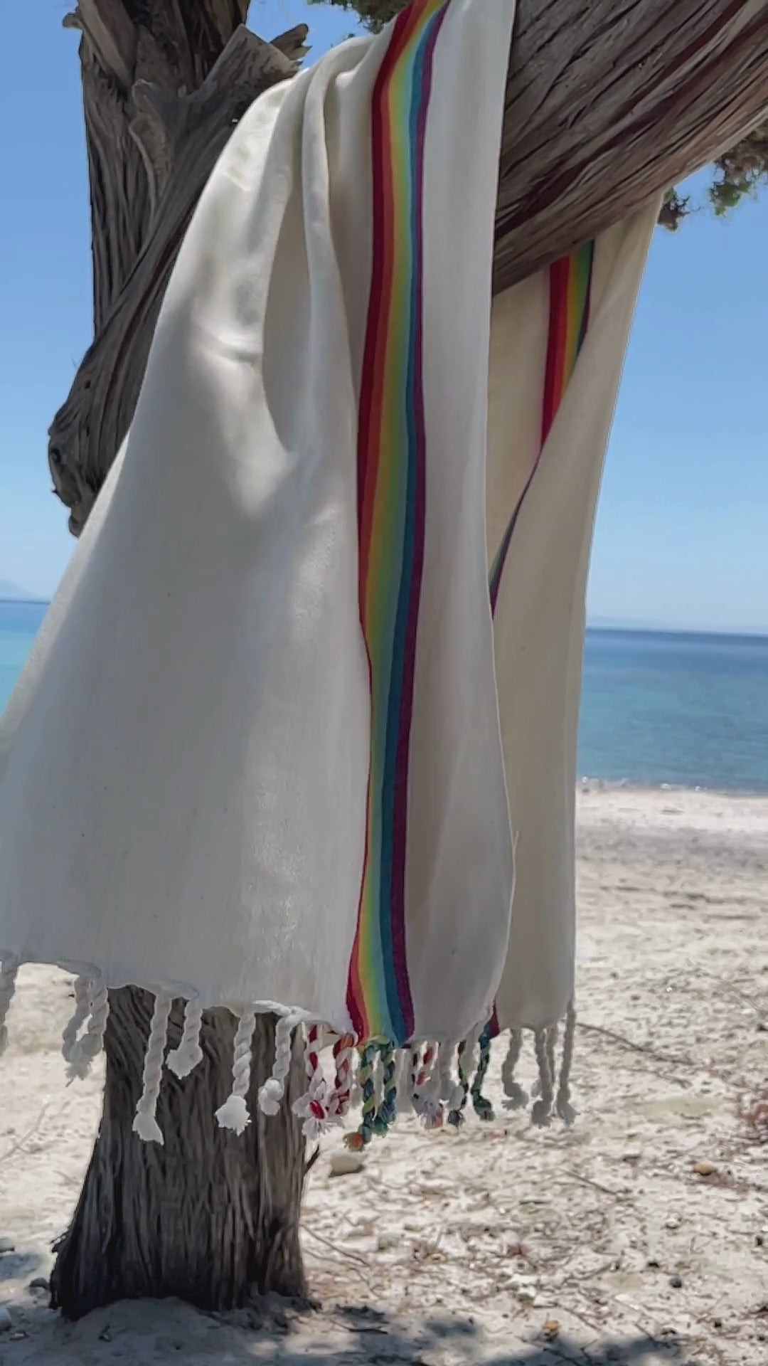 Experience the soft, quick-drying Bambou Rainbow hammam towel! This versatile beige towel features vibrant rainbow stripes, adding a playful touch. Perfect as a beach towel, scarf, or throw, its 50/50 cotton-bamboo blend ensures absorbency and rapid drying. Lightweight and sand-resistant, it's ideal for travel and home use. Handcrafted in Türkiye with Oeko-Tex certified materials, it's a sustainable, stylish alternative to traditional towels.