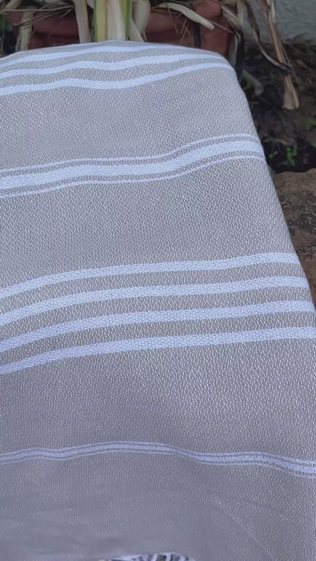 This generously sized Samimi hammam towel, handcrafted in Türkiye's Aegean Coast, features a classic striped pattern in a sophisticated beige, defined as a light sandy grayish-brown, complemented by hand-twisted fringes, offering versatile use as a towel, scarf, shawl, or throw. Made from 100% Oeko-Tex certified cotton, this lightweight and compact towel is designed for quick-drying and superior absorbency, making it perfect for beach, pool, travel, or home décor, while its sand-resistant weave ensures easy maintenance, offering a more sustainable and elegant alternative to conventional terry towels.