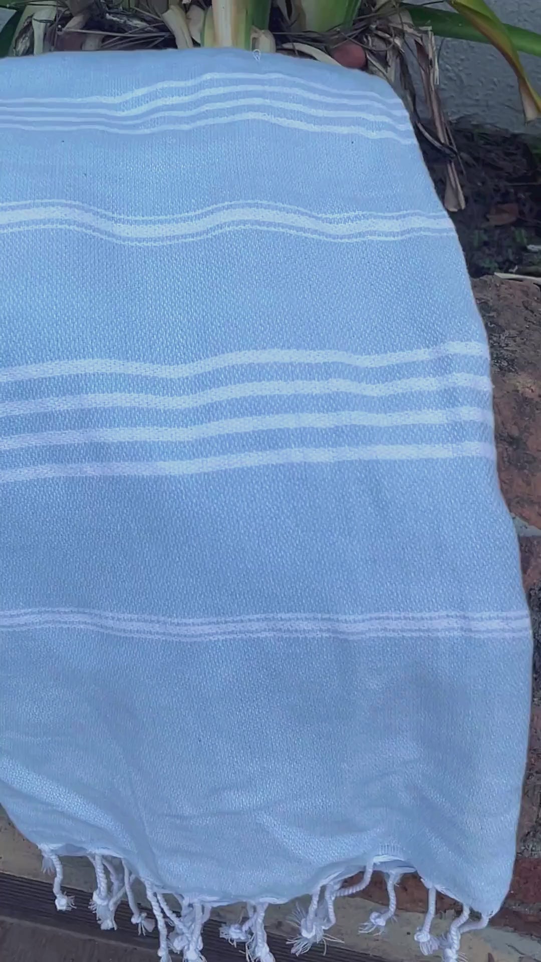 Indulge in the luxurious comfort of our Amara hammam towel, a versatile essential crafted in Türkiye's Aegean Coast. Featuring a classic striped pattern against a serene light blue hue—reminiscent of the clear Aegean sky—this towel boasts hand-twisted fringes and a finely woven texture. Made from 100% Oeko-Tex certified cotton, it's not only sumptuously soft and generously sized for ultimate comfort, but also exceptionally quick-drying, absorbent, and sand-resistant, making it perfect for beach days, travel, or home décor. Its lightweight and compact design ensures it folds effortlessly into any bag, while its durable construction and eco-friendly nature make it a sustainable alternative to conventional towels.