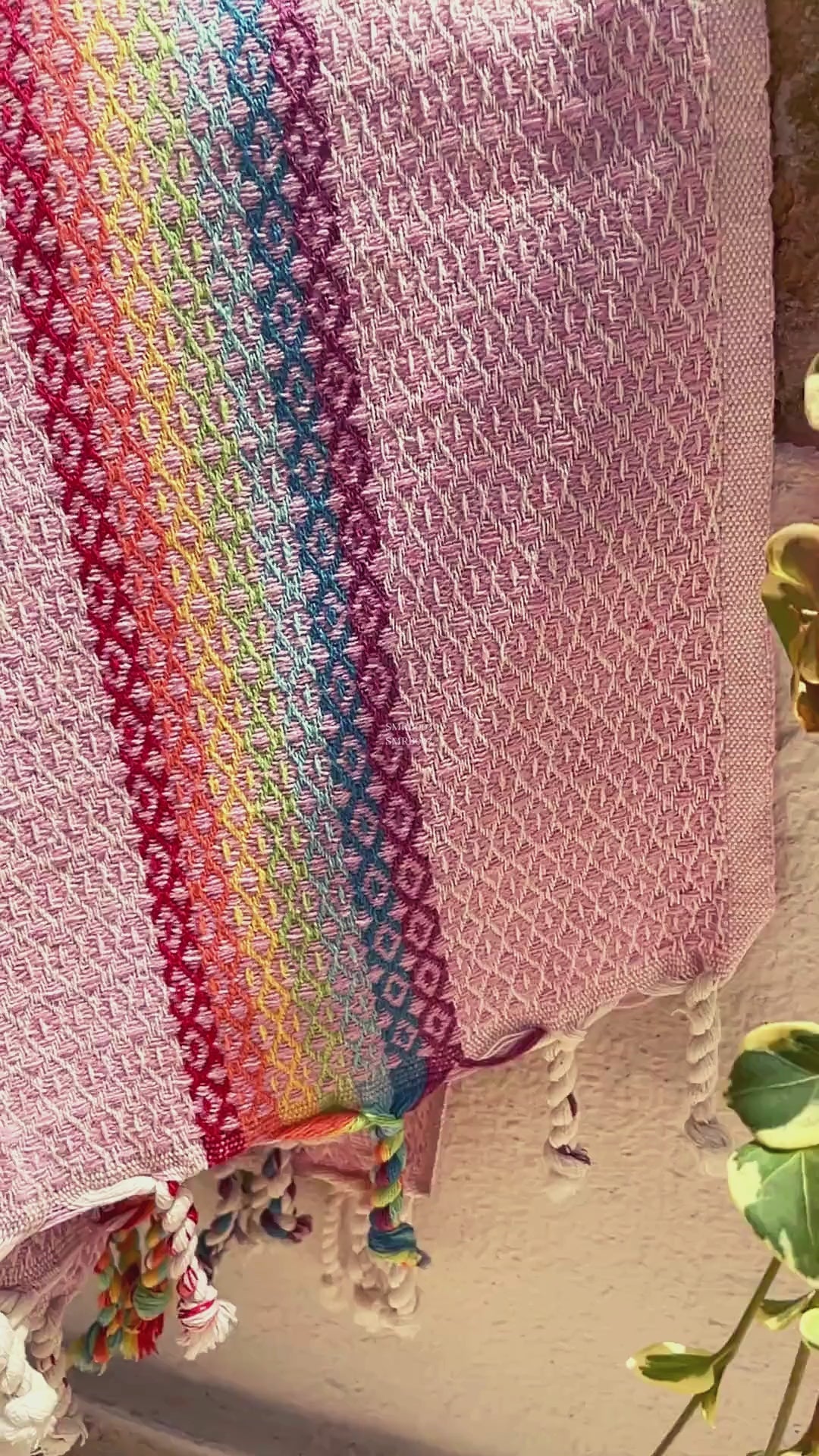 Samimi Rainbow hammam towel is featuring a finely woven diamond pattern accented with striking rainbow stripes and a base color of pink—a light, cheerful hue ranging from soft rose to blush, evoking feelings of warmth and playfulness. This versatile towel can be used as a beach towel, scarf, shawl, throw, or even as home décor, making it perfect for any occasion—whether at the beach, pool, sauna, gym, yoga session, or while traveling. Woven from 100% Oeko-Tex certified cotton, it offers superior absorbency and dries quickly, keeping you fresh and dry after every use. Lightweight and compact, it folds easily into any bag for on-the-go convenience. Its sand-resistant feature ensures that you stay clean and ready for your next adventure. Handcrafted with beautiful patterns and hand-twisted fringes on Türkiye’s Aegean Coast, this towel is not only eco-friendly but also durable, offering a sustainable alternative to conventional towel